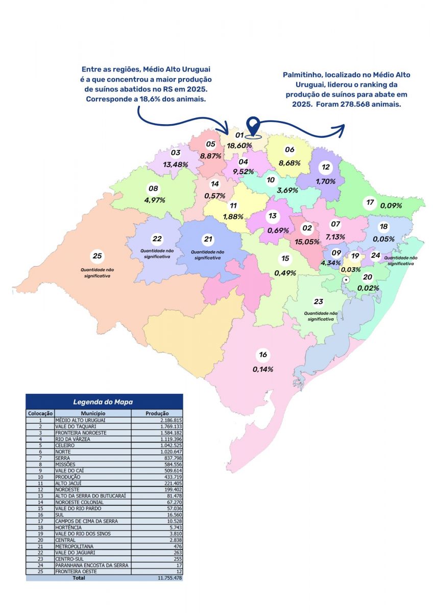 No ranking dos municípios produtores, Palmitinho assumiu a liderança estadual, com 278.568 suínos destinados ao abate, ultrapassando Rodeio Bonito, que aparece na segunda posição com 246.291 cabeças. Em terceiro lugar está Nova Candelária, com 233.976 suínos, seguida por Aratiba (231.390) e Pinheirinho do Vale (225.503), que completam o grupo dos cinco maiores produtores do Estado.